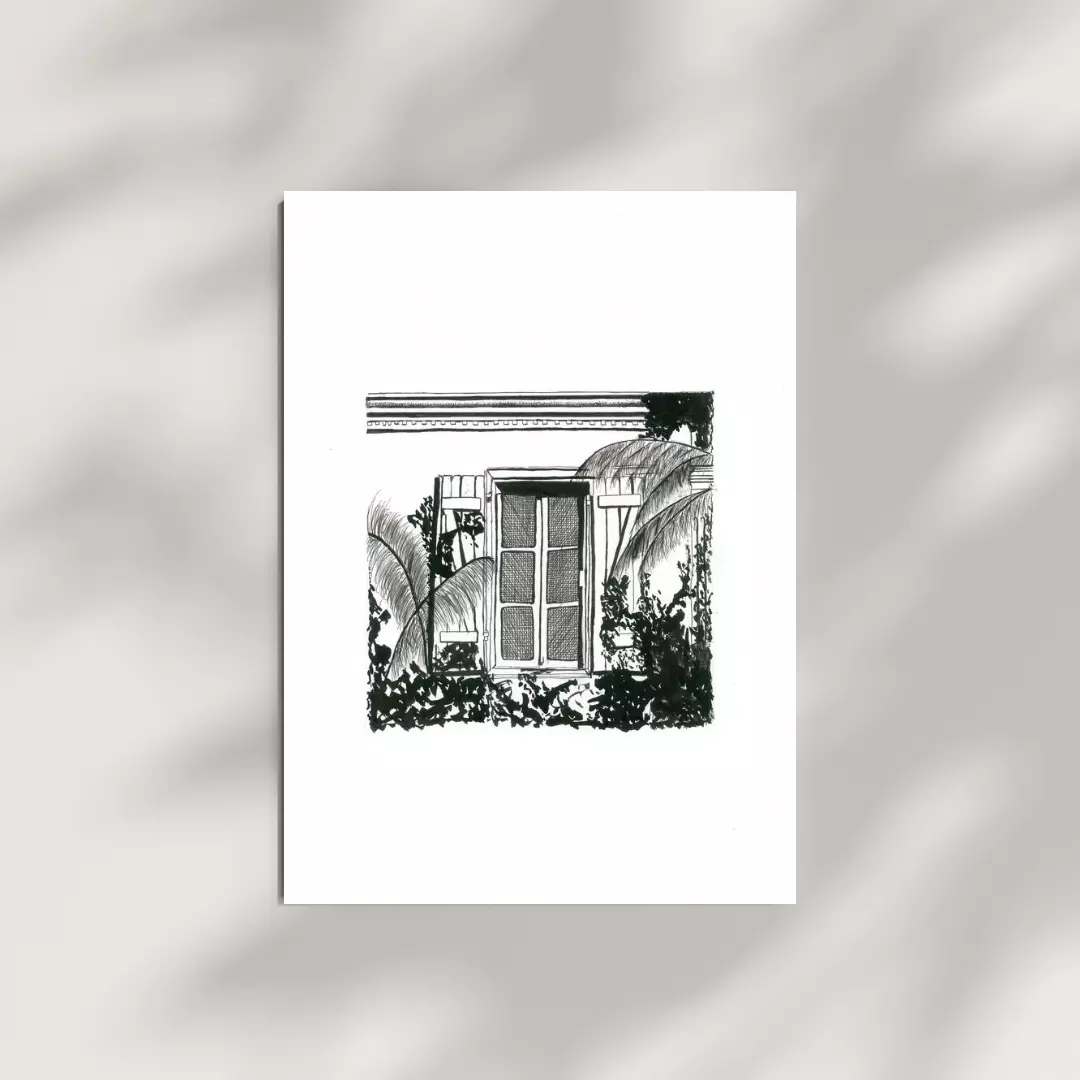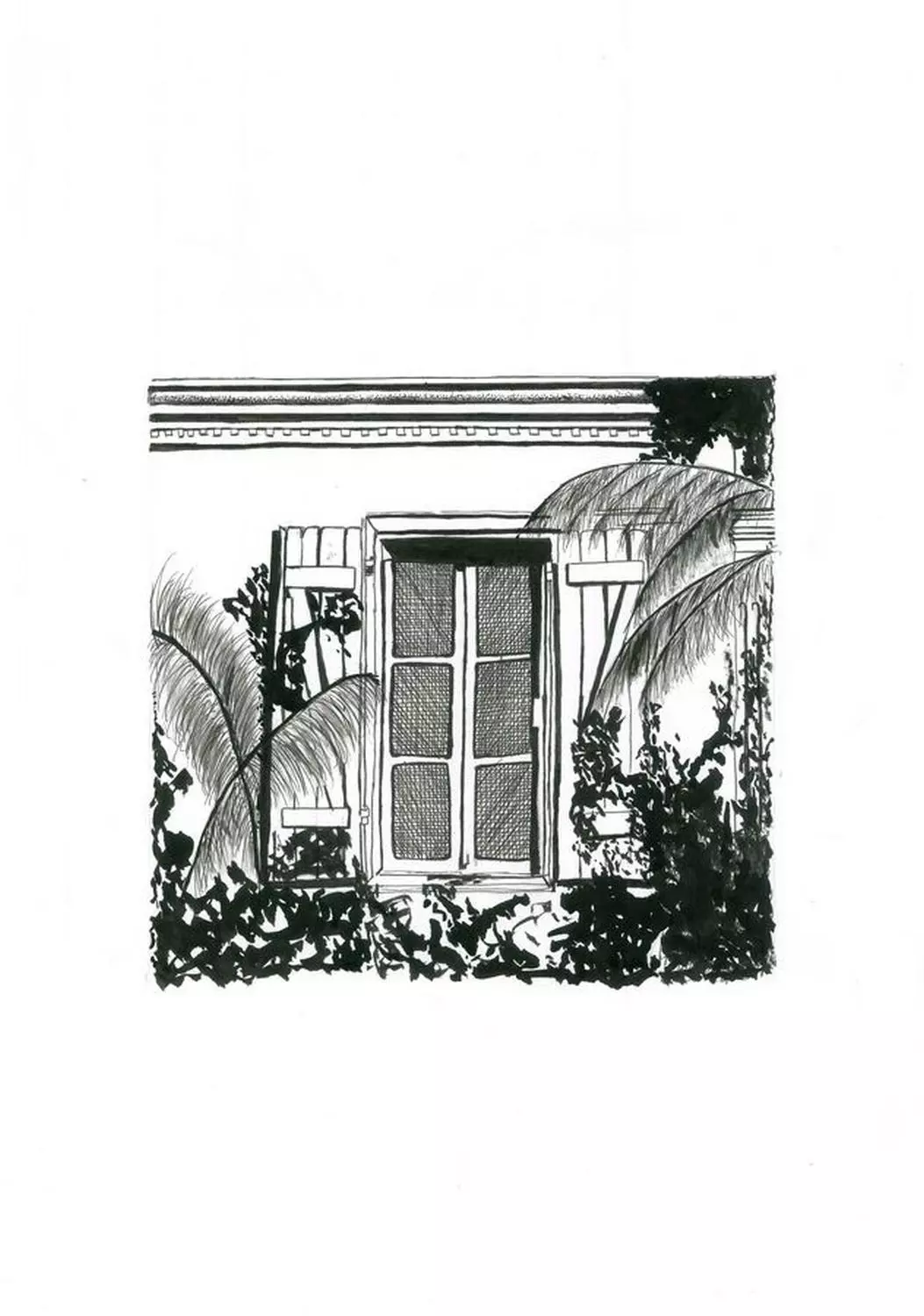 J’ai dessiné cette fenêtre en imaginant une maison baignée de soleil, quelque part à La Réunion.