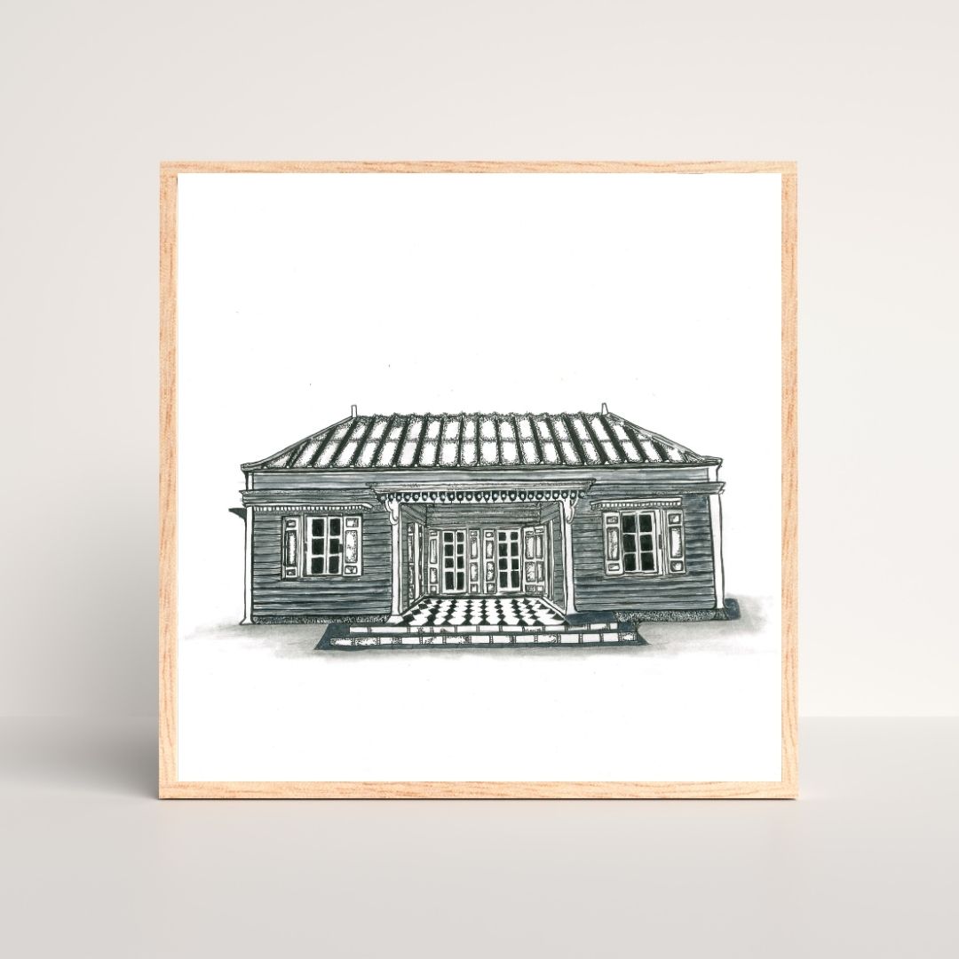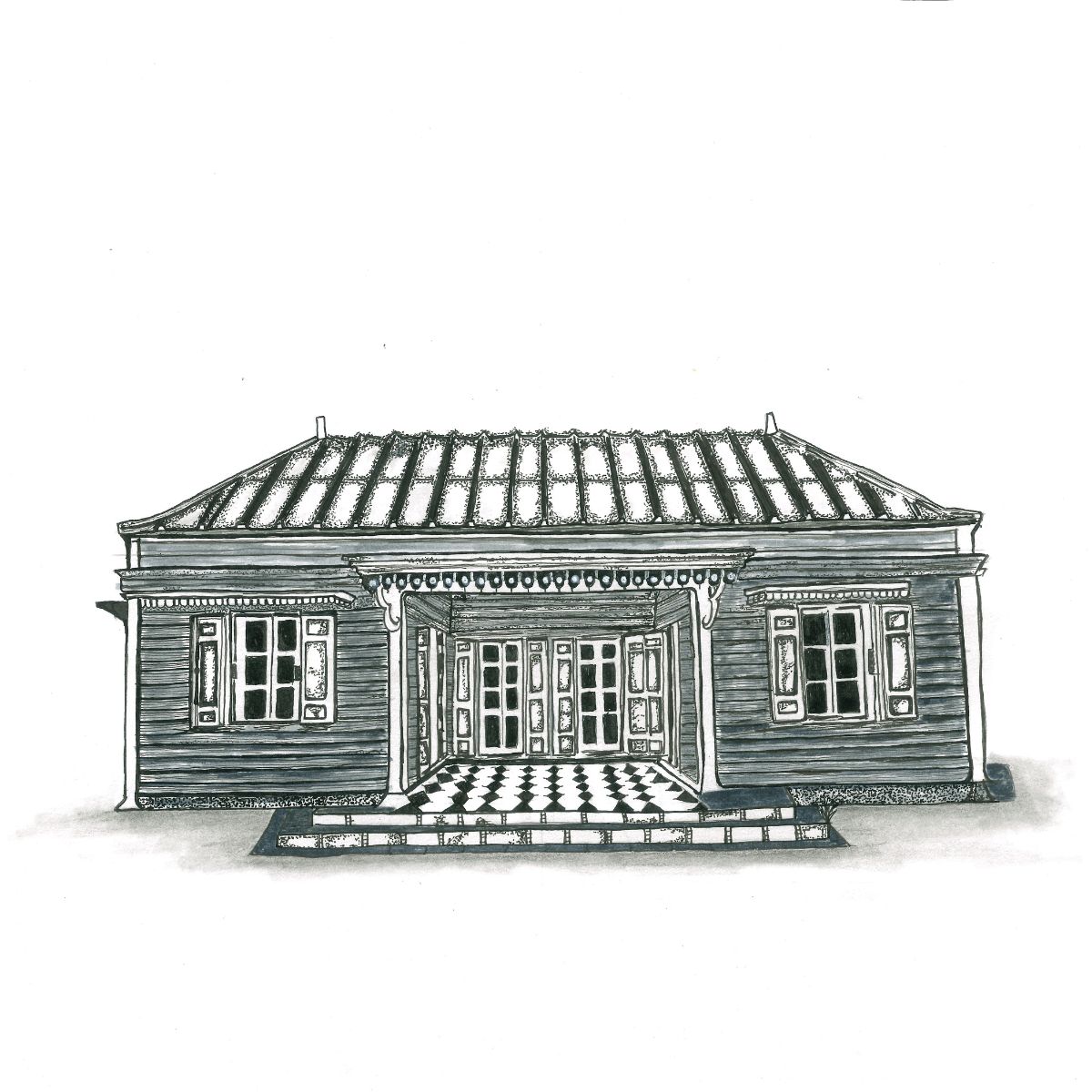 Ce dessin à l’encre de Chine et lavis offre un regard différent sur la même maison créole réunionnaise : épurée de toute végétation, la façade se révèle dans toute sa richesse architecturale.