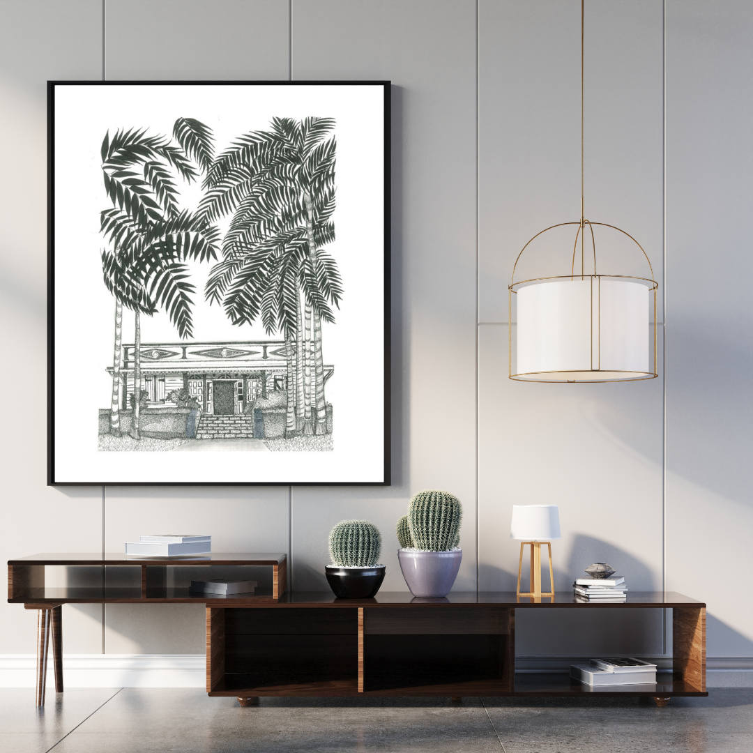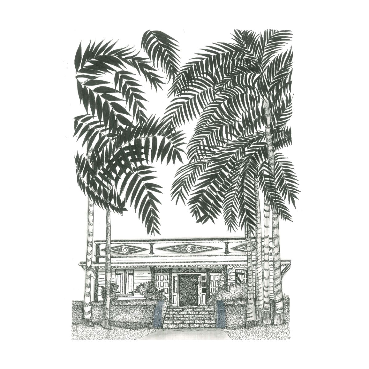 Nichée à 400 mètres d’altitude quelque part dans les Hauts de La Réunion, cette case créole est entourée de grands palmiers royaux dont les feuilles semblent occuper la quasi-totalité du ciel. Chaque détail, depuis la frise ouvragée qui embellit la façade jusqu’au superbe escalier en pierre menant à l’entrée — chaque détail a été minutieusement dessiné à l’encre de Chine avec précision, trait par trait.