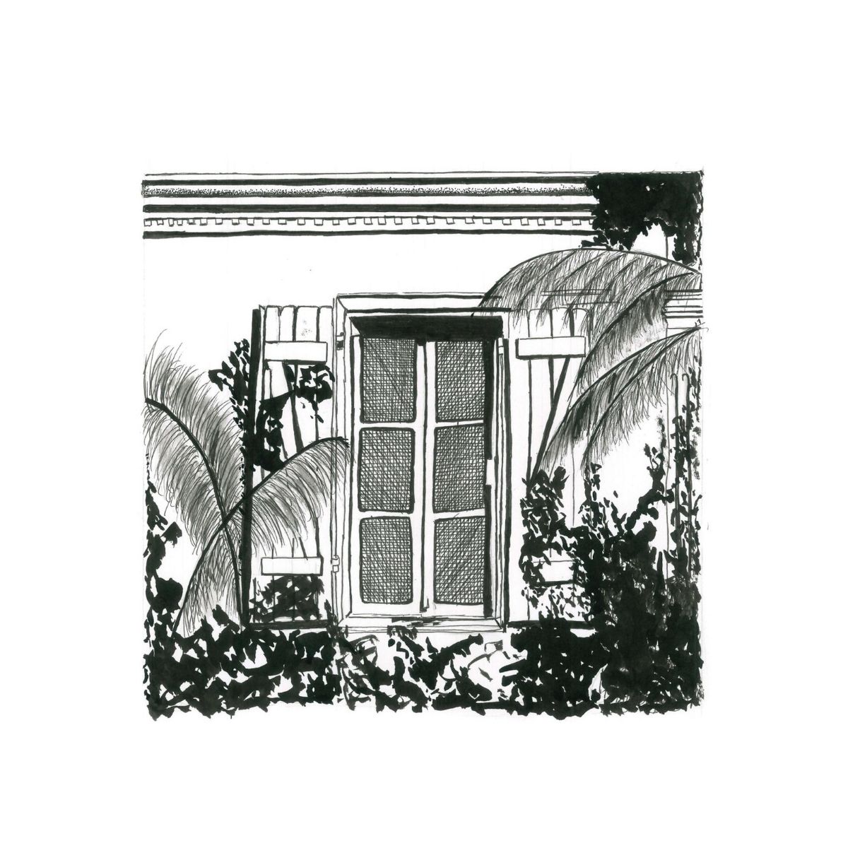 Ce dessin à l’encre de Chine est né d’un souvenir précis de mon île, La Réunion. J’ai voulu capturer ce contraste si particulier entre la fraîcheur de la varangue et la chaleur du soleil qui frappe les persiennes en bois.
