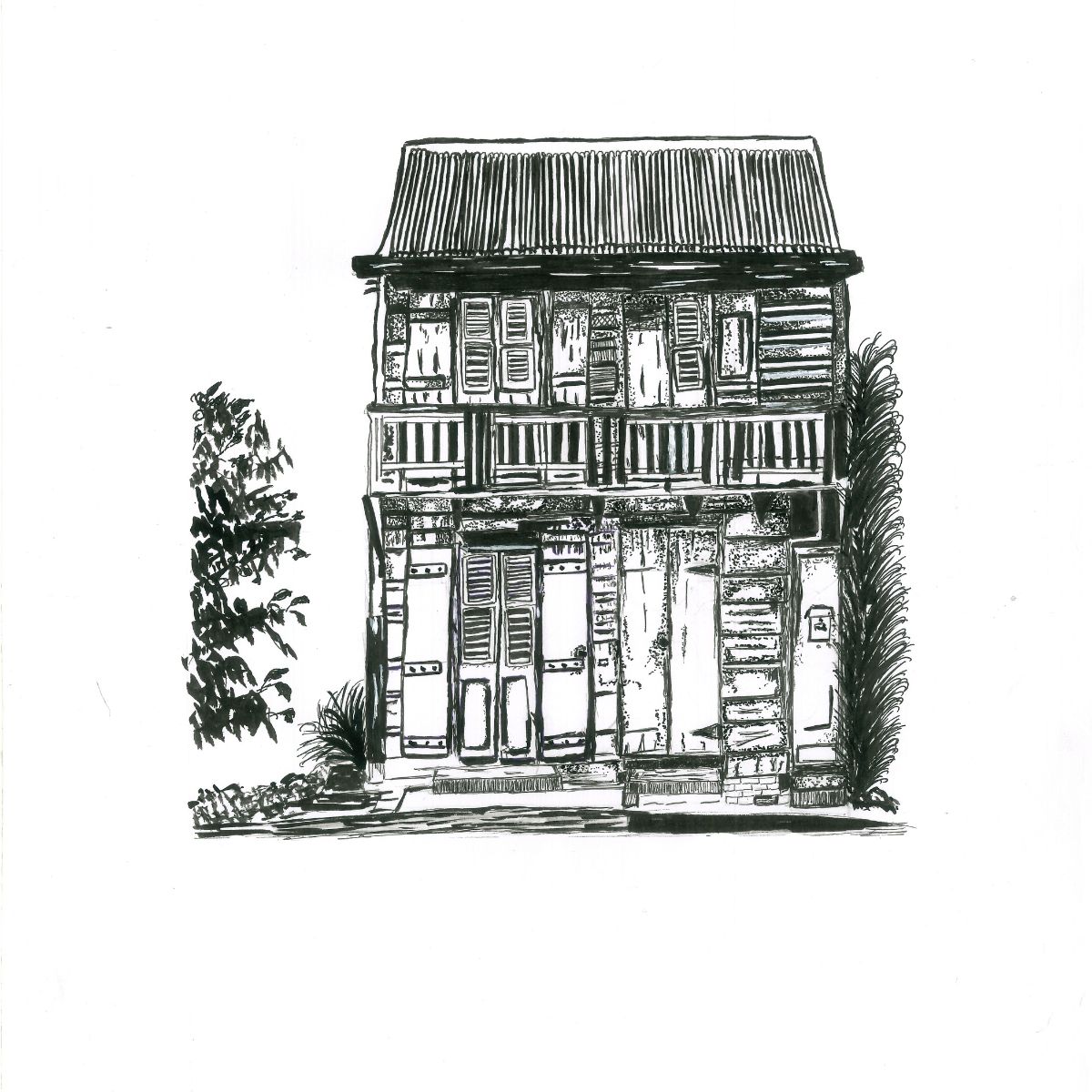 Réalisé entièrement à l’encre de Chine, trait par trait, ce dessin représente une maison créole typique de Marie-Galante. La végétation déborde de chaque côté, le toit penche légèrement, les volets sont mi-clos.