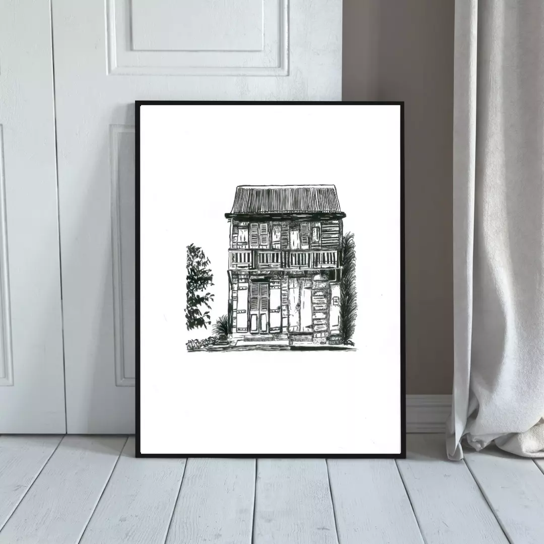 Un noir-et-blanc sensible qui capture l’âme des cases créoles : lignes fines, textures patinées, lumière tropicale. Hommage poétique au patrimoine.